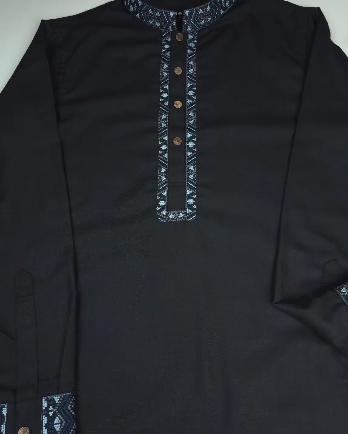 This Panjabi features tasteful embroidery on the neckline and cuff area, adding a touch of clean craftsmanship without overpowering the design.