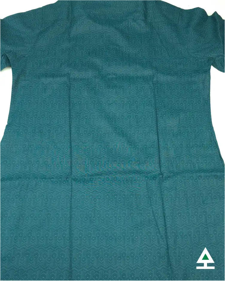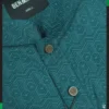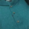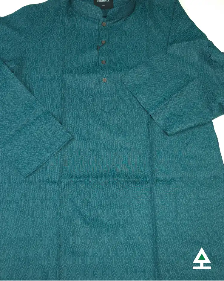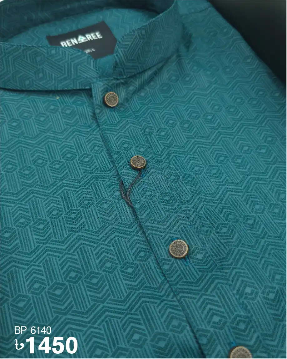 On color printed design on the deep sea paste panjabi. Complemented by rustic metal button.