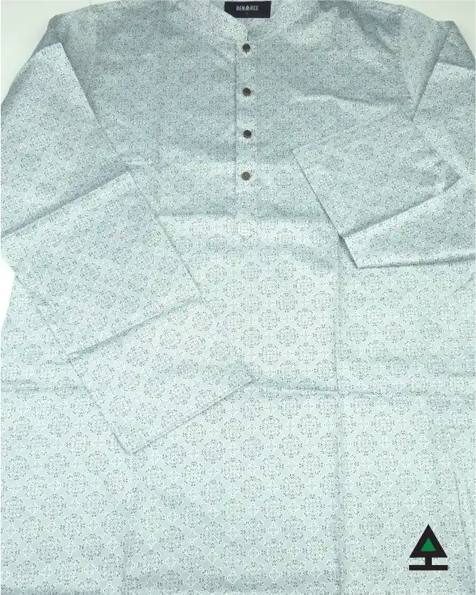Whole body print on baked biscuit color panjabi. Metal push button to complement the body work.