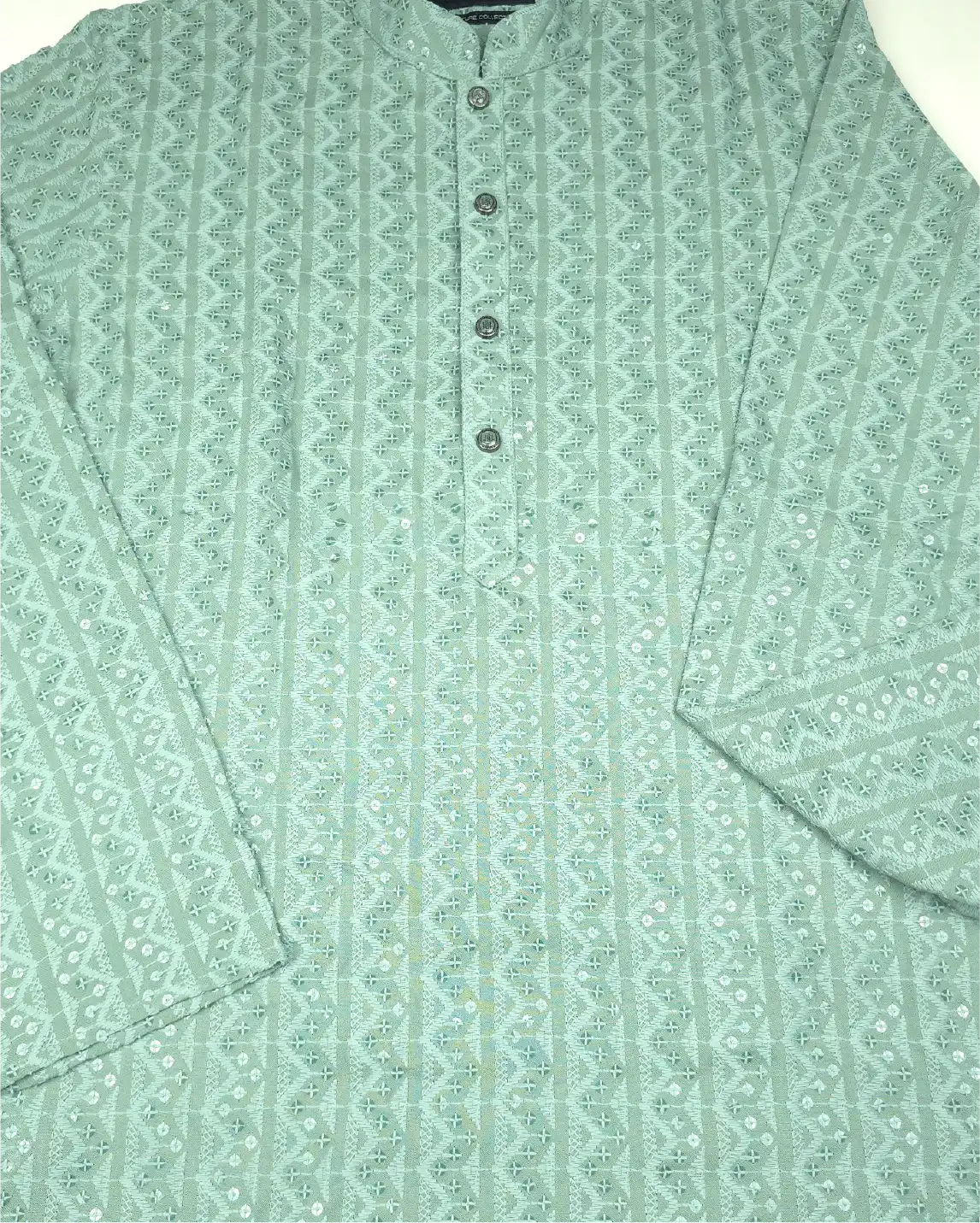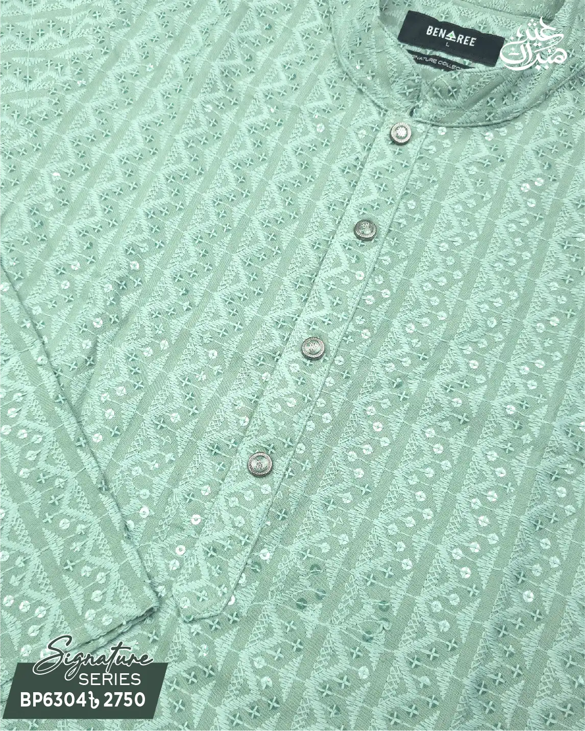 Decorated with fine sequence (sequin) work, this Panjabi brings festive glamour while maintaining a balanced ethnic appeal.