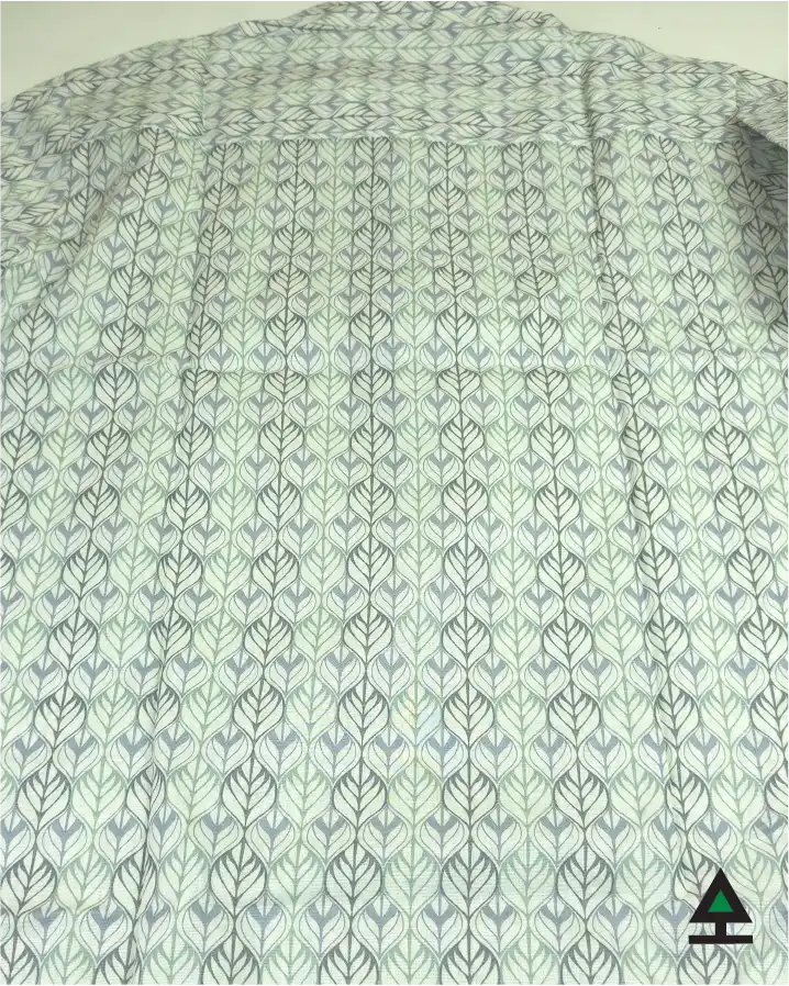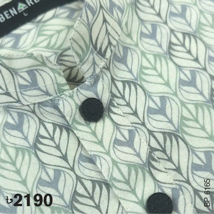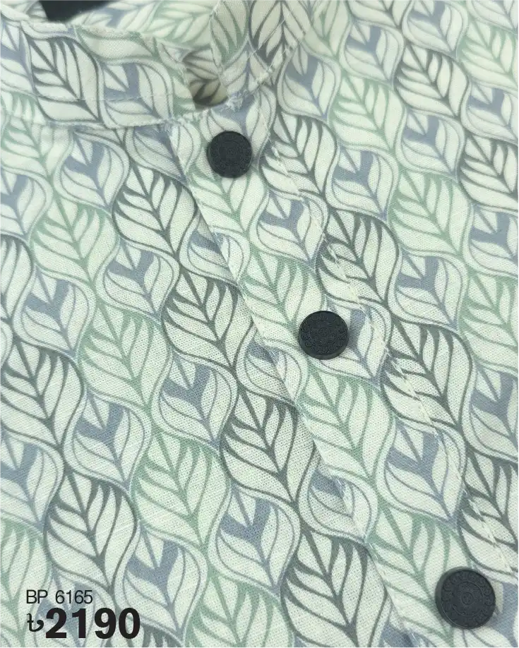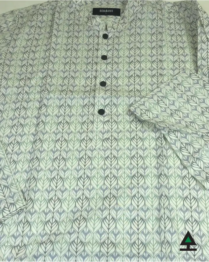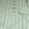 Leaf based pattern design print off white panjabi. Black metal push button to complement the pattern work.